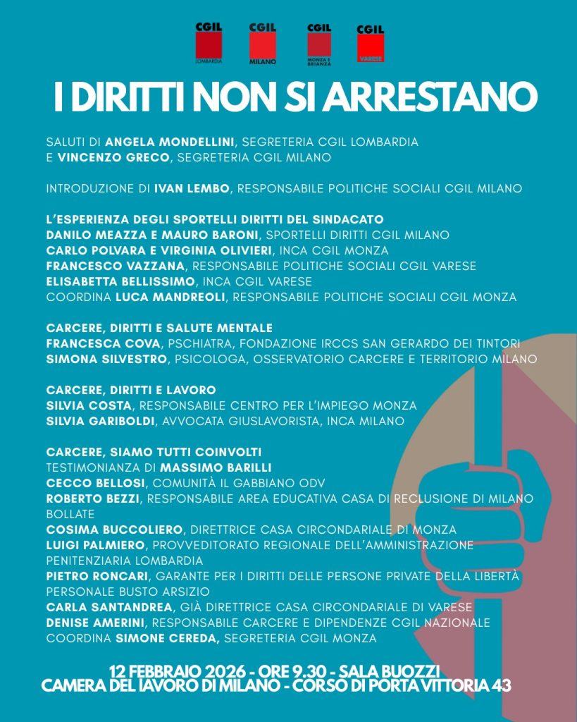 I diritti non si arrestano, nemmeno dietro le sbarre. Con questo messaggio CGIL Milano, Varese, Monza e Brianza e CGIL Lombardia promuovono l’iniziativa “I diritti non si arrestano”, in programma giovedì 12 febbraio alle ore 9.30 alla Camera del Lavoro di Milano, Sala Buozzi (Corso di Porta Vittoria 43).