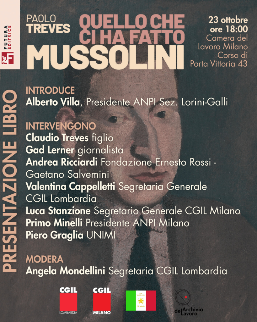 Giovedì 23 ottobre, alle ore 18.00, presso la Camera del Lavoro di Milano (Corso di Porta Vittoria 43), si terrà la presentazione del libro di Paolo Treves, “Quello che ci ha fatto Mussolini”, pubblicato da Futura Editrice.